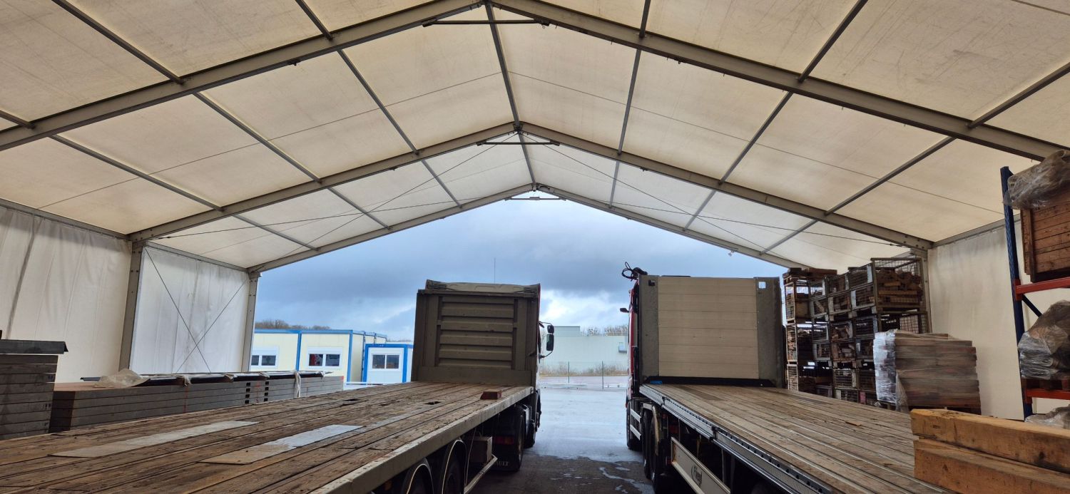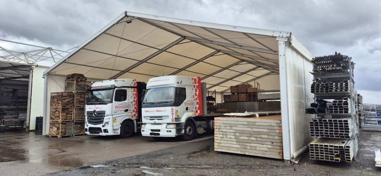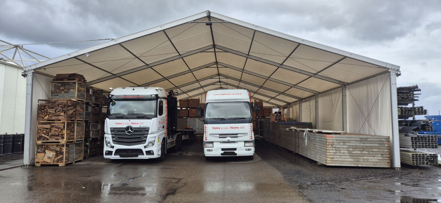 Ossature en aluminium, pièces de jonction et d'ancrage en acier galvanisé, entoilages (bâches de toiture) neufs.